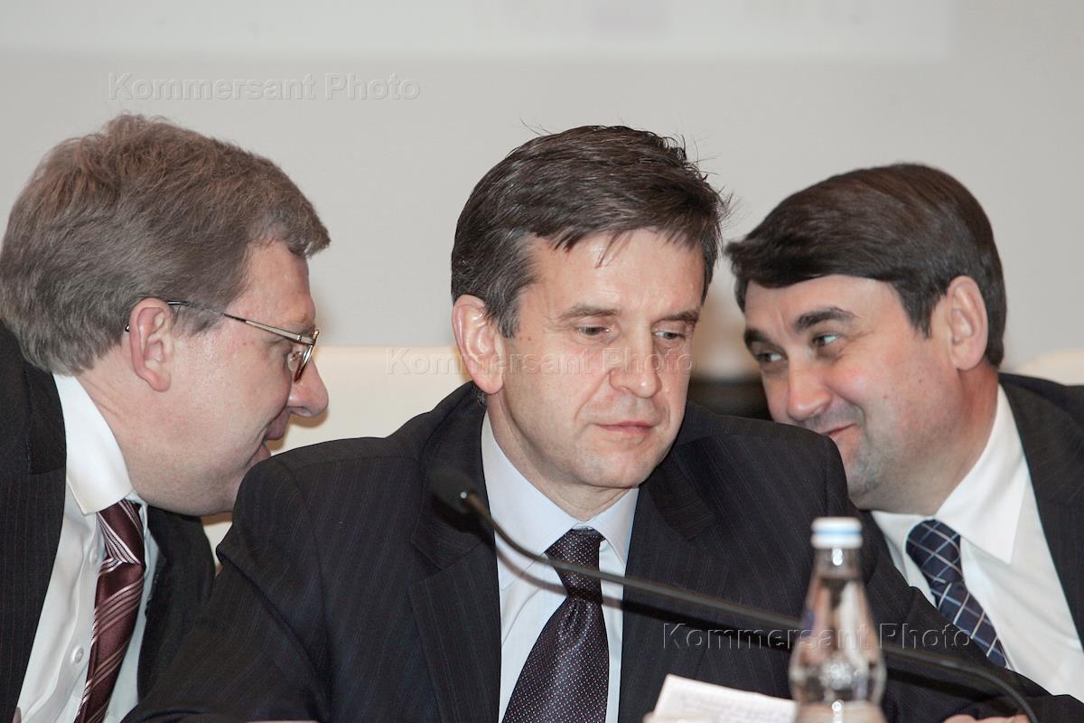 Министр финансов России Алексей Кудрин (слева), министр здравоохранения и социального развития России Михаил Зурабов (в центре) и министр транспорта и связи России Игорь Левитин (справа) на парламентских слушаниях комитета Государственной Думы России по труду и социальной политике по реализации 122 - го закона. Слушания прошли в здании Госдумы.