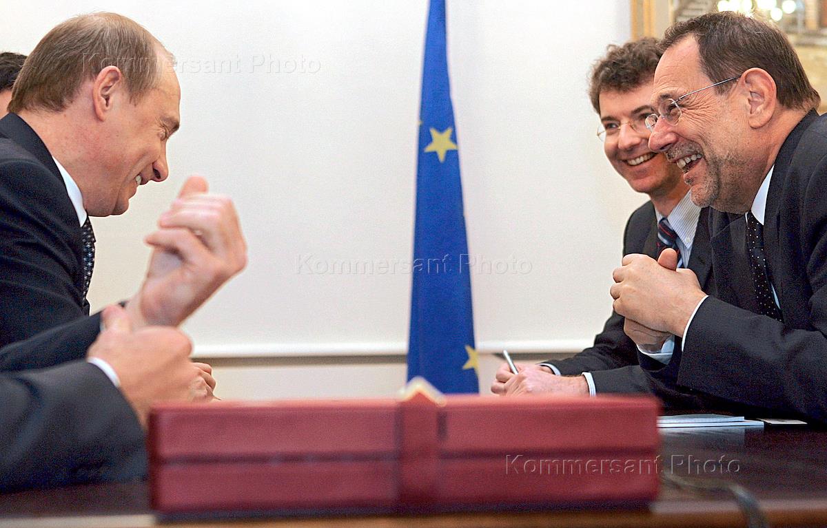Russian President Vladimir Putin (left) met EU foreign policy chief Javier Solana (right). The meeting was held in the Russian presidential residence of Bocharov Ruchey outside the Back Sea resort of Sochi.