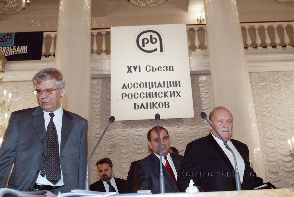 Chairman of the Russian Central Bank Sergey Ignatyev (second right) and President of the Russian Banks Association (ARB) Garegin Tosunyan (right) attend the 16th congress of the Association of Russian Banks. The event was held in the Unions House Pillar Hall.