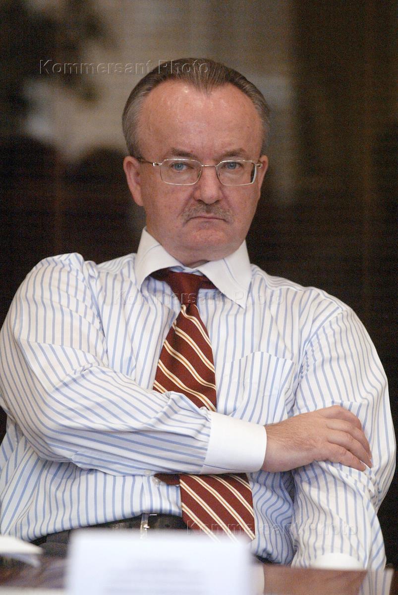 Alexander Karlashov, EvrazHolding's corporate and external relations manager, takes part in a press conference.
