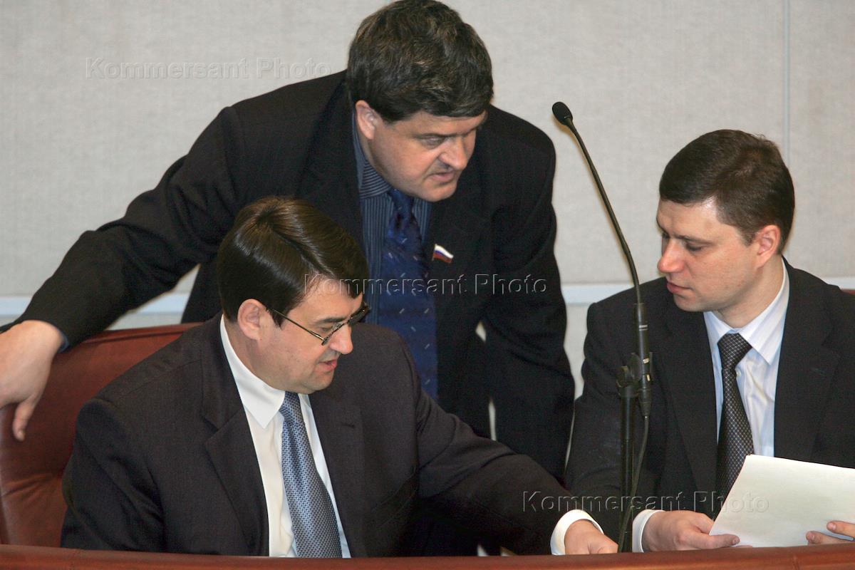 Russian State Duma lawmaker, member of the federation issues and regional policies committee Vladimir Ryzhkov (center) and vice chair of the Duma's constitutional legislation and state-building committee, member of the LDPR faction Alexey Mitrofanov (right) take part in a session of the State Duma.