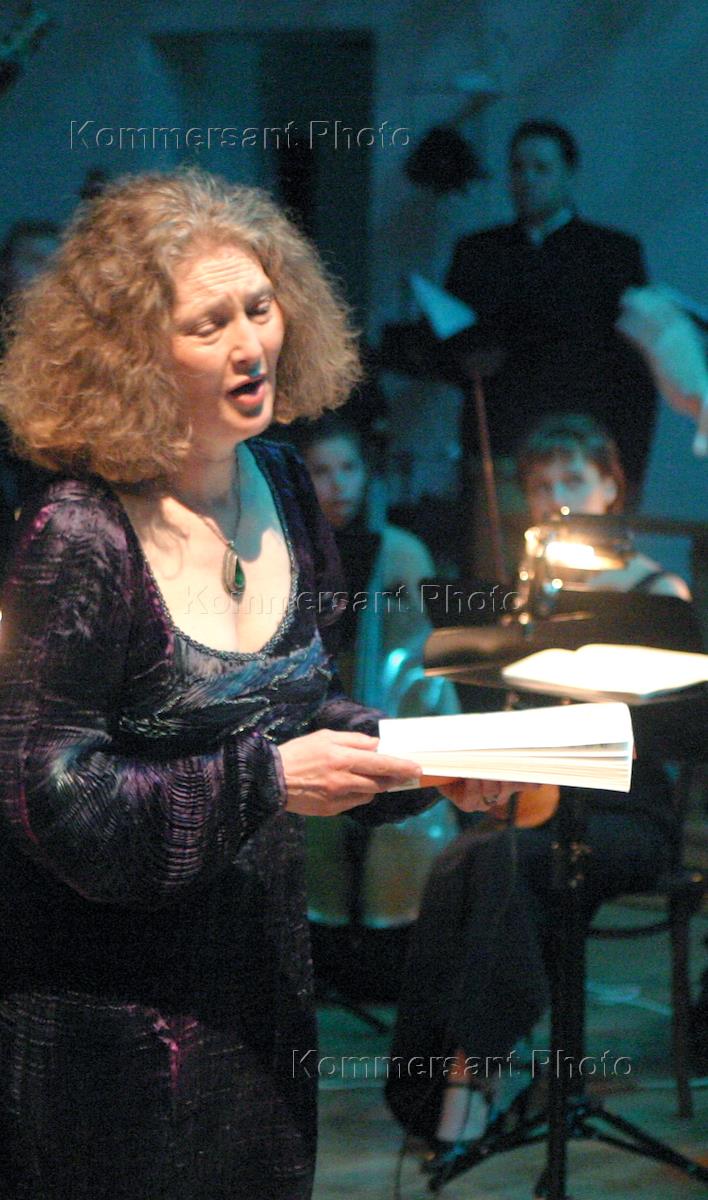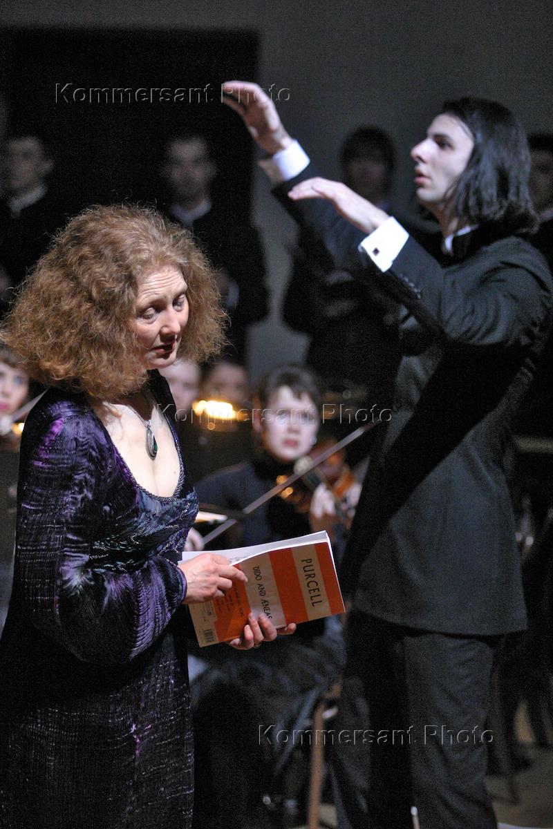Английская певица Эмма Керкби (слева) и дирижер Теодор Курентзис во время исполнения оперы Перселла "Дидона и Эней" на сцене театра "Школа драматического искусства".