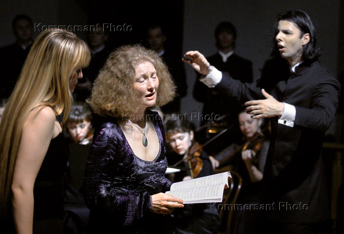 Главный дирижер Новосибирского государственного академического театра оперы и балета Теодор Курентзис (справа) и оперная певица из Великобритании Эмма Керкби (сопрано) (в центре) во время представления оперы "Дидона и Эней" на сцене Школы драматического искусства.