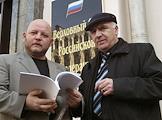 Lawyers of prominent Krasnoyarsk entrepreneur Vilor Struganov, a.k.a. Pasha-Tsvetomusyka (Strobe-light) - Dmitry Kurepin and Rolan Gegiya stand in front of the Russian Supreme Court building. The Court delayd the session on the suit filed over legality of the verdict to Vilor Struganov.