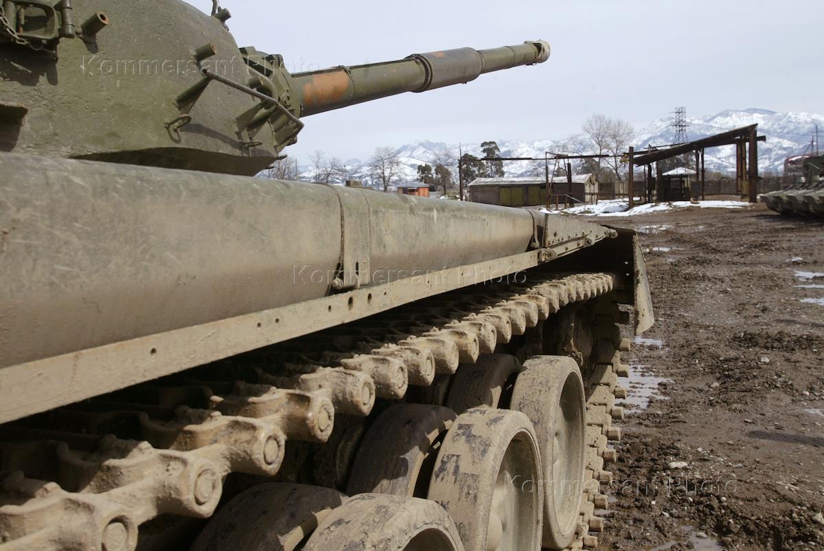 Боевая техника на российской военной базе в Грузии. Боец танковой части чисти ствол танка.