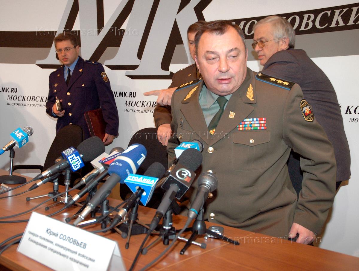 Commander of the special task units (the former Moscow district of the air and anti-aircraft force) Colonel-General Yury Solovyev (left) attends a press conference summoned to discuss the problem of anti-aircraft defence of Moscow.
