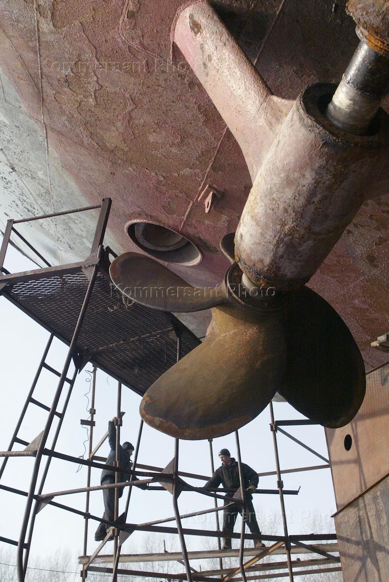 Workers prepare a Volgotanker company freighter for navigation during winter berthing.