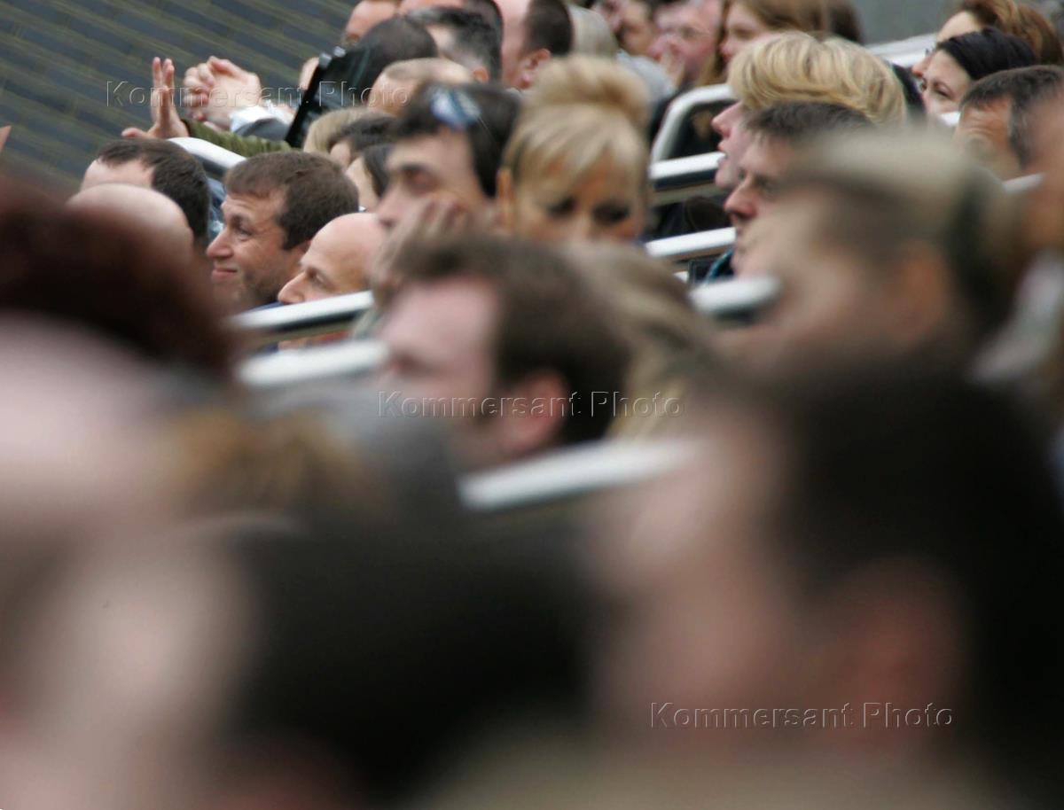 Губернатор Чукотского автономного округа, владелец футбольной команды "Челси" (Великобритании) Роман Абрамович (слева) на трибуне во время матча между футбольными командами "Челси" и "Бирмингем". Матч прошел в рамках 32-го тура английской премьер-лиги. Счет встречи 1 : 1.