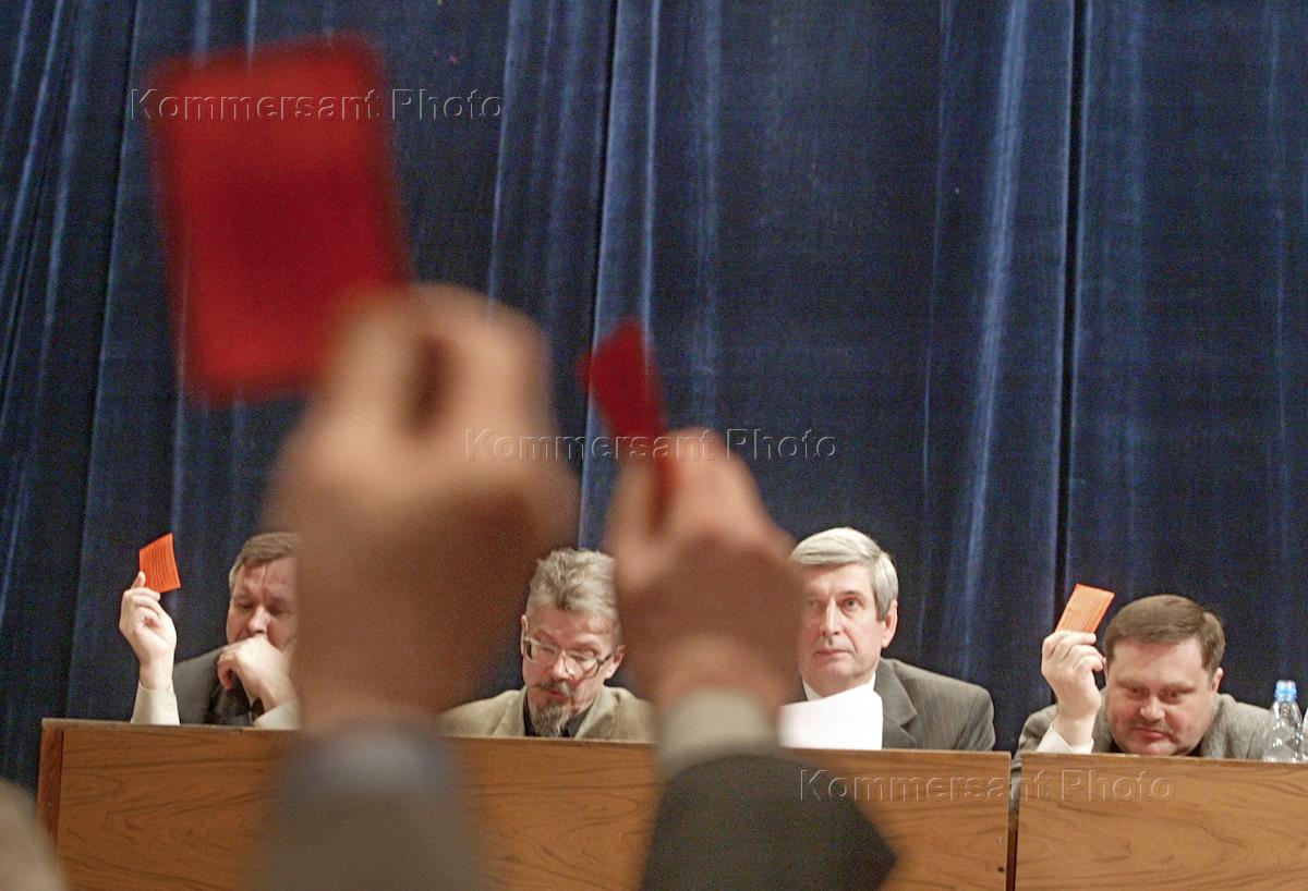Член фракции Коммунистической партии России (КПРФ) в Государственной Думы России Виктор Илюхин (слева), лидер Коммунистической партии России (КПРФ), руководитель фракции КПРФ в Государственной Думе России Геннадий Зюганов (второй слева), писатель, лидер Национал-большевистской партии (НБП) Эдуард Лимонов (второй справа) и заместитель председателя ЦК Коммунистической партии России (КПРФ), член Комитета Государственной Думы России по образованию и науке Иван Мельников (справа) на собрании первой инициативной подгруппы по проведению инициируемого КПРФ референдума, который касается ряда общественно-политических и экономических вопросов. Собрание состоялось в Доме культуры "Красный Октябрь".