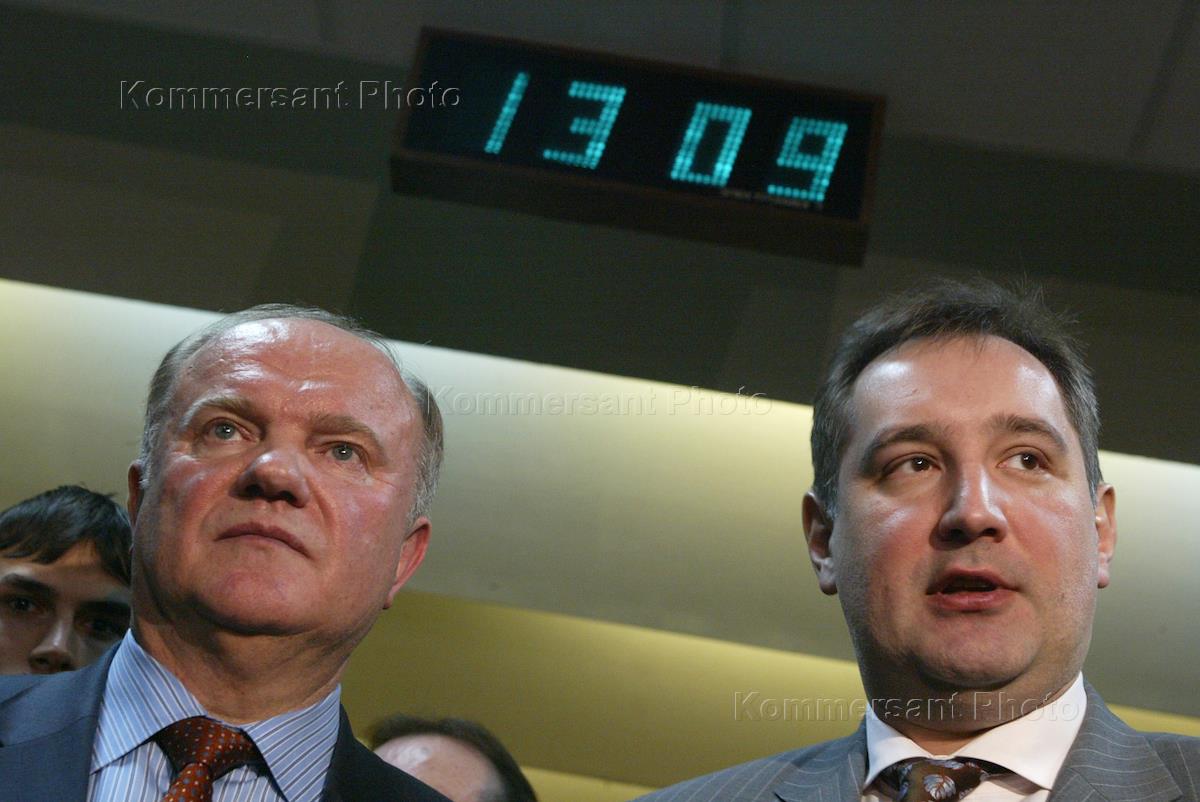 Лидер Коммунистической партии России (КПРФ), руководитель фракции КПРФ в Государственной Думе России Геннадий Зюганов (слева) и председатель фракции "Родина" в Государственной Думе России Дмитрий Рогозин (справа) на собрании первой инициативной подгруппы по проведению инициируемого КПРФ референдума, который касается ряда общественно-политических и экономических вопросов. Собрание состоялось в Доме культуры "Красный Октябрь".