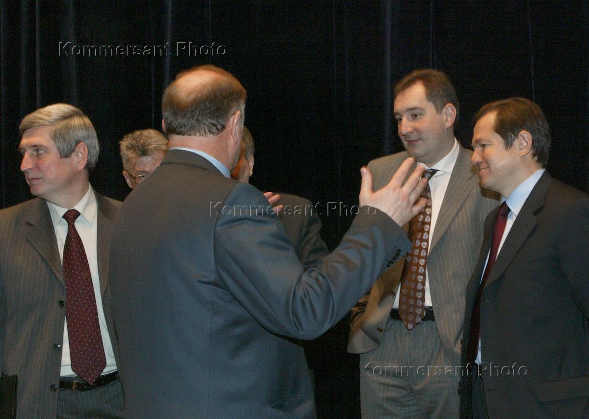 Лидер Коммунистической партии России (КПРФ), руководитель фракции КПРФ в Государственной Думе России Геннадий Зюганов (в центре), председатель фракции "Родина" в Государственной Думе России Дмитрий Рогозин (второй справа) и лидер общественной общероссийской организации "За достойную жизнь", депутат Государственной Думы России Сергей Глазьев (справа) на собрании первой инициативной подгруппы по проведению инициируемого КПРФ референдума, который касается ряда общественно-политических и экономических вопросов. Собрание состоялось в Доме культуры "Красный Октябрь".
