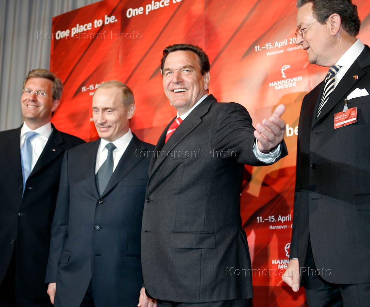 Russian President Vladimir Putin (centre), Alexey Miller (the second to the right), CEO of the Russian giant natural gas producer Gazprom, German Chancellor Gerhard Schroeder (left) and Russian Energy and Industries Minister Victor Khristenko (right) take part in the opening ceremony of the Hannover trade fair.