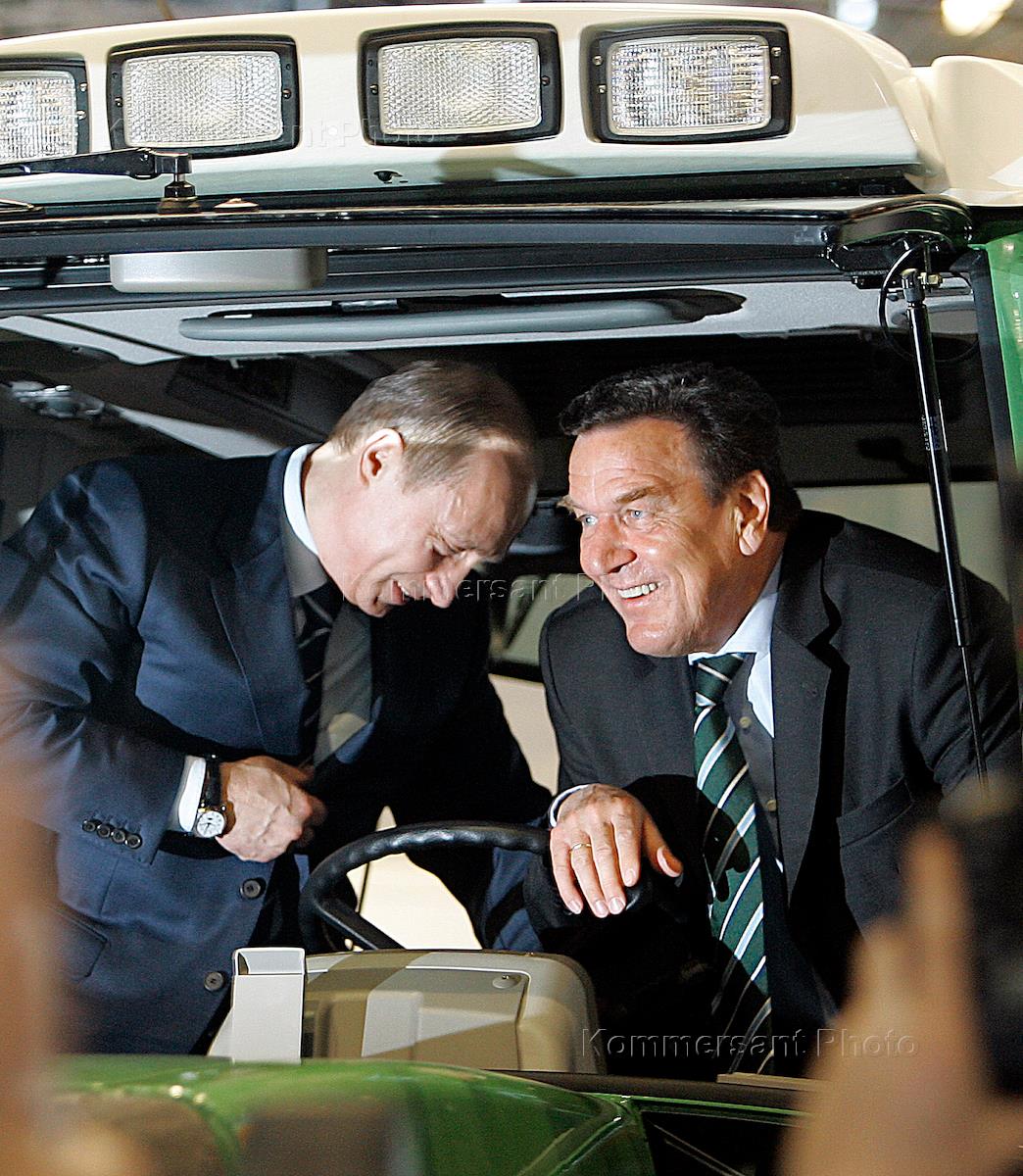 Президент России Владимир Путин (слева) и канцлер ФРГ Герхард Шредер (справа) в салоне нового автомобиля на церемонии открытия Ганноверской промышленной ярмарки.