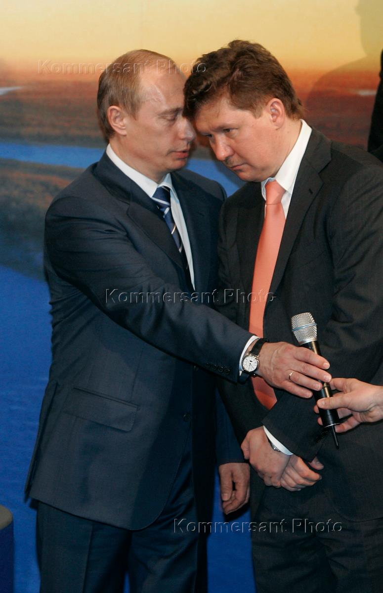 Президент России Владимир Путин (слева) и глава РАО "Газпром" Алексей Миллер (справа) на церемонии открытия Ганноверской промышленной ярмарки.