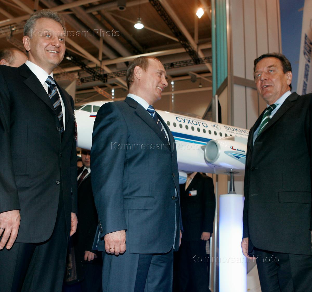 Генеральный директор Авиационной холдинговой компании "Сухой" Михаил Погосян (слева) и президент России Владимир Путин (справа) на церемонии открытия Ганноверской промышленной ярмарки.