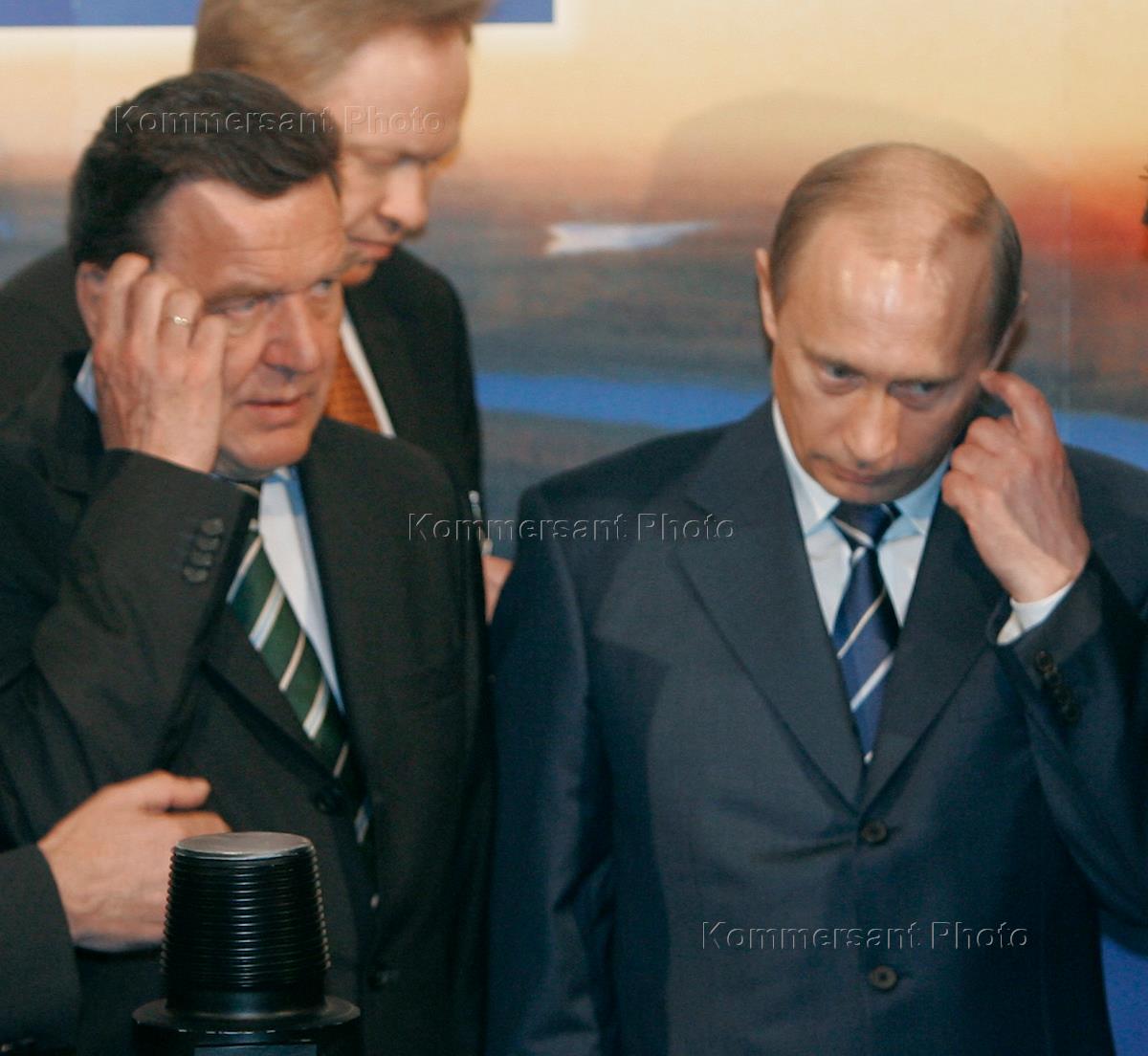 Президент России Владимир Путин (справа) и канцлер ФРГ Герхард Шредер (слева) на церемонии открытия Ганноверской промышленной ярмарки.