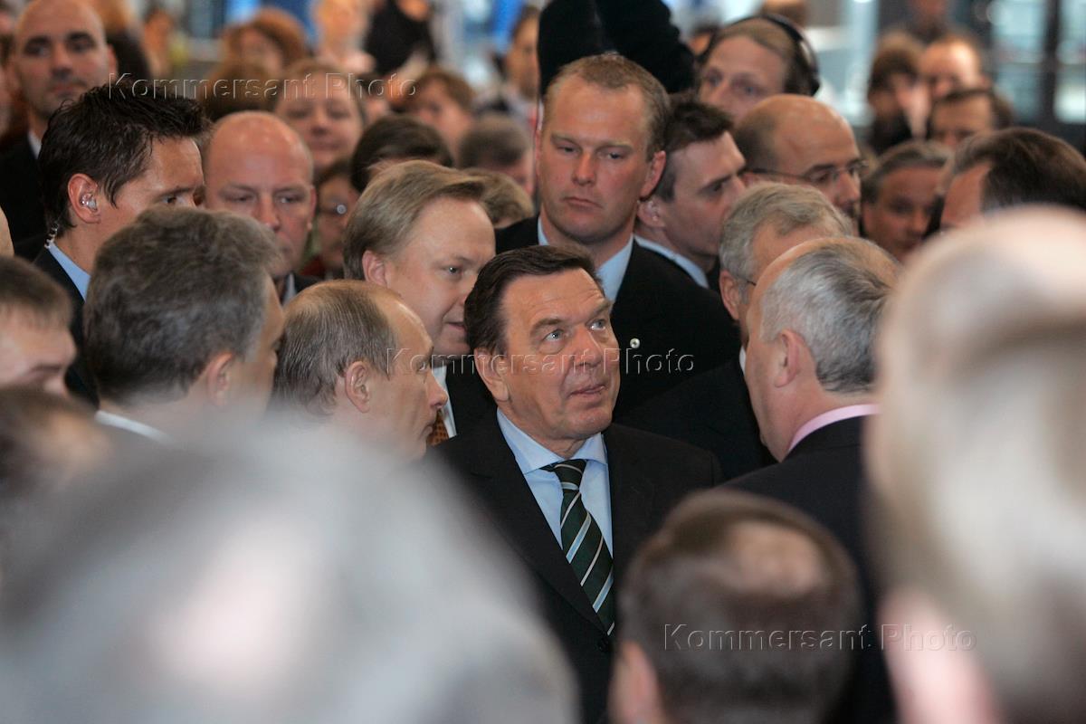 Президент России Владимир Путин (слева) и канцлер ФРГ Герхард Шредер (справа) на церемонии открытия Ганноверской промышленной ярмарки.