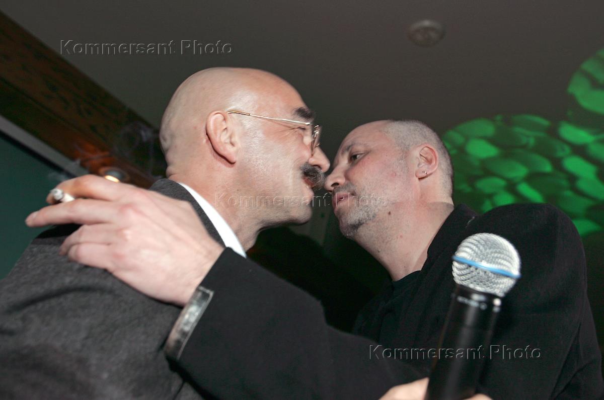 Генеральный директор Издательского дома (ИД) "Коммерсантъ" Андрей Васильев (слева) и солист группы "Несчастный случай" Алексей Кортнев (справа) на презентации музыкального альбома на стихи Андрея Васильева "Взрослые песни". Презентация состоялась в кафе "КоммерсантЪ".