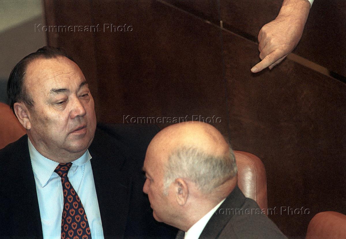 Президент Республики Башкортостан Муртаза Рахимов (крайний слева) и президент Республики Ингушетия Руслан Аушев (крайний справа) на заседании Совета Федерации.