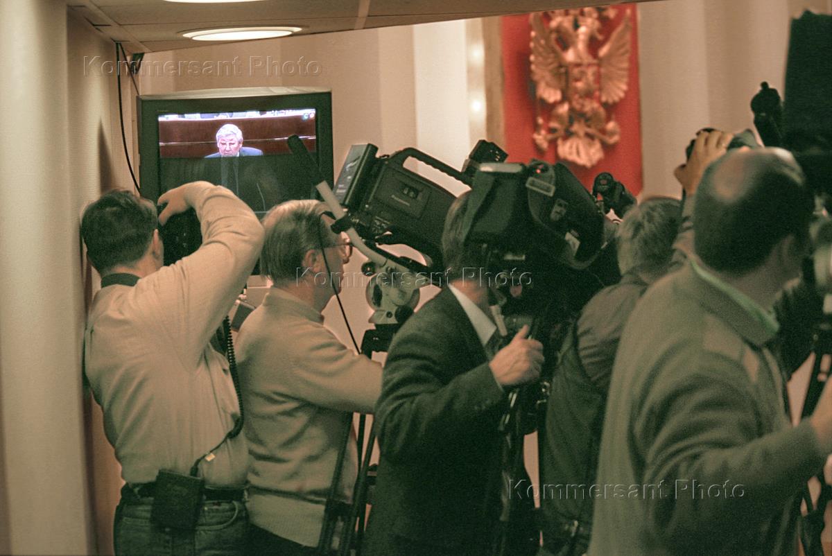 Television camera-men and photographers stand on a balcony of the hall where was held the State Duma meting.