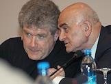 Председатель правления Центра политических технологий Марк Урнов (слева) и экономист, научный руководитель Государственного Университета "Высшая школа экономики" Евгений Ясин (справа) на совместном заседании клуба "Открытый форум" и национального инвестиционного совета в гостинице "Марриотт-Гранд".
