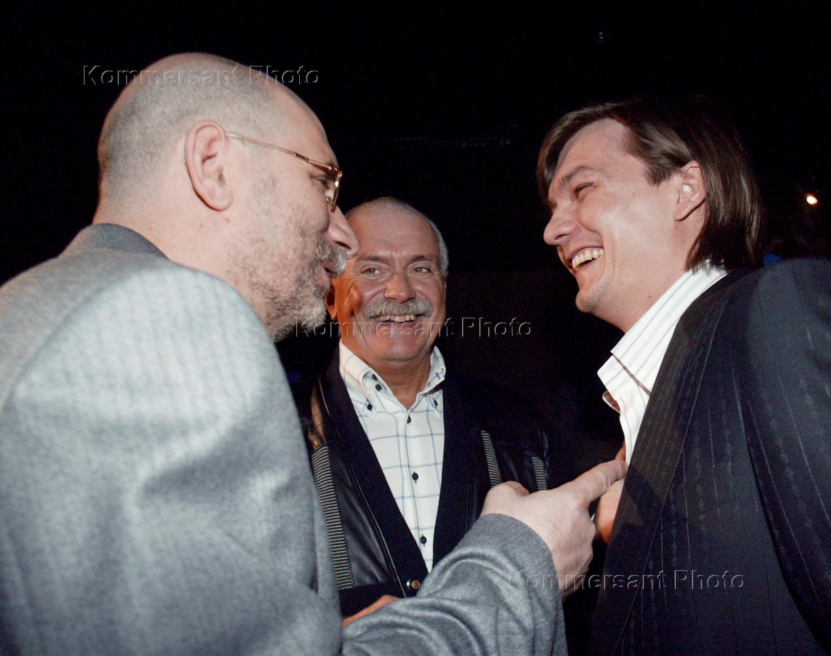 Председатель союза кинематографистов России, кинорежиссер Никита Михалков (в центре) перед началом пресс-показа фильма "Статский советник" по роману Бориса Акунина (слева) режиссера Филиппа Янковского (справа). Показ фильма прошел в кинотеатре "Пушкинский".