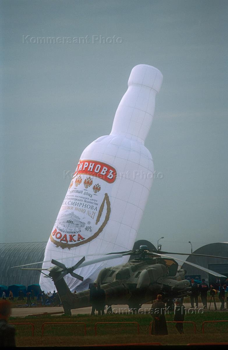 The big inflatable bottle of vodka "Smirnoff" is looked at the Moscow Aviation and Space Salon "MAKS-97".