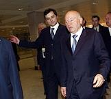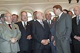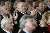 Председатель Московской городской думы Владимир Платонов (второй ряд слева), мэр Москвы Юрий Лужков (в центре), управляющий делами Президента России Владимир Кожин (второй ряд справа) и художественный руководитель театра "Ленком" Марк Захаров (первый ряд слева) на церемонии открытия после восстановления центрального выставочного зала "Манеж".