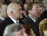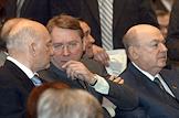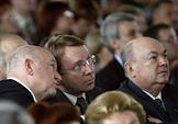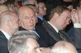 Председатель Московской городской думы Владимир Платонов (слева), мэр Москвы Юрий Лужков (в центре) и управляющий делами Президента России Владимир Кожин (справа)на церемонии открытия после восстановления центрального выставочного зала "Манеж".