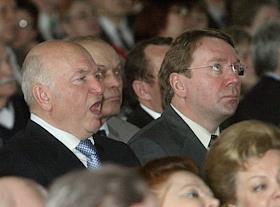 Мэр Москвы Юрий Лужков (слева) на церемонии открытия после восстановления центрального выставочного зала "Манеж".