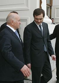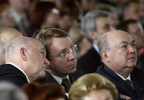 Заместитель главы администрации Президента России Владислав Сурков (слева) и мэр Москвы Юрий Лужков (справа) на церемонии открытия после восстановления центрального выставочного зала "Манеж".