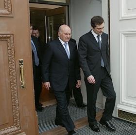 Мэр Москвы Юрий Лужков (слева) и заместитель главы администрации Президента России Владислав Сурков (справа) на церемонии открытия после восстановления центрального выставочного зала "Манеж".