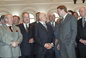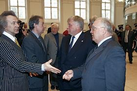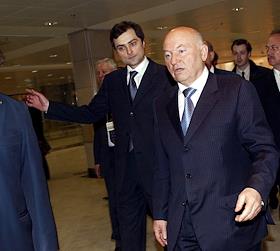 Мэр Москвы Юрий Лужков (в центре), управляющий делами Президента России Владимир Кожин (второй справа), первый заместитель мэра Москвы, руководитель комплекса архитектуры, строительства, развития и реконструкции Москвы Владимир Ресин (третий справа), первый заместитель мэра Москвы, руководитель Комплекса экономической политики и развития города Юрий Росляк (третий слева) и президент Российской Академии художеств Зураб Церетели (слева) на церемонии открытия после восстановления центрального выставочного зала "Манеж". "