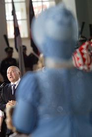 Участник церемонии открытия после восстановления центрального выставочного зала "Манеж".