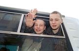 Новобранцы осеннего призыва прощаются с родственниками из окна автобуса.