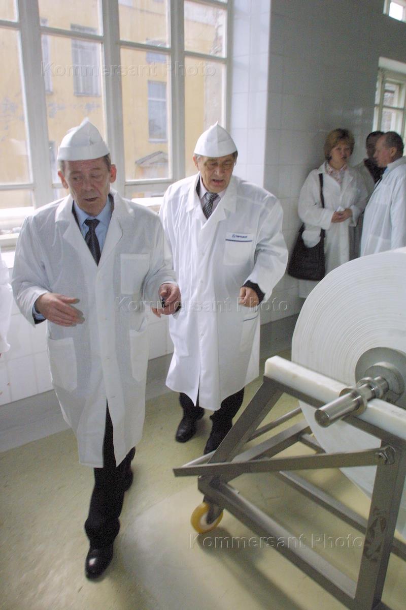 Генеральный директор завода "Пентмол" Валентин Поляков (слева) и писатель Эдуард Успенский (справа) на линии производства продуктов под названием "Продукты из Простоквашино" на комбинате "Петмол". Недавно предприятие подписало с писателем авторский договор и патентное соглашение на использование для своих молочных продуктов принадлежащих господину Успенскому брендов.