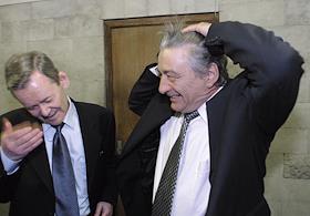 Генеральный директор завода "Петмол" Валентин Поляков (слева) и писатель Эдуард Успенский (справа) после осмотра линии по производству продуктов под названием "Продукты из Простоквашино" на комбинате "Петмол". Недавно предприятие подписало с писателем авторский договор и патентное соглашение на использование для своих молочных продуктов принадлежащих господину Успенскому брендов.