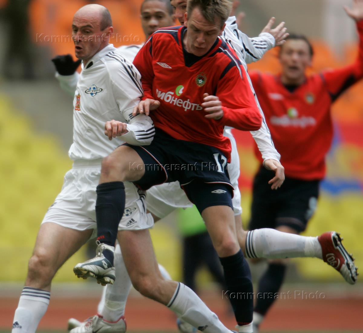 Игрок футбольной команды "Сатурн" Виктор Онопко (слева) и игрок команды "ЦСКА" Милош Красич (в центре) во время матча Кубка России по футболу в 1/4 финала между командами "ЦСКА" и "Сатурн". Матч прошел на Большой спортивной арене "Лужники".