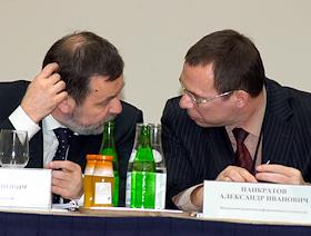 Президент Российского Союза Автостраховщиков (РСА) Андрей Кигим (слева) и заместитель руководителя Федерального агентства по информационным технологиям Александр Панкратов (справа) на пресс-конференции по итогам семинара на тему "Информационно-технологическое обеспечение обязательного страхования автогражданской ответственности". Пресс-конференция прошла в гостинице "Балчуг-Кемпински".