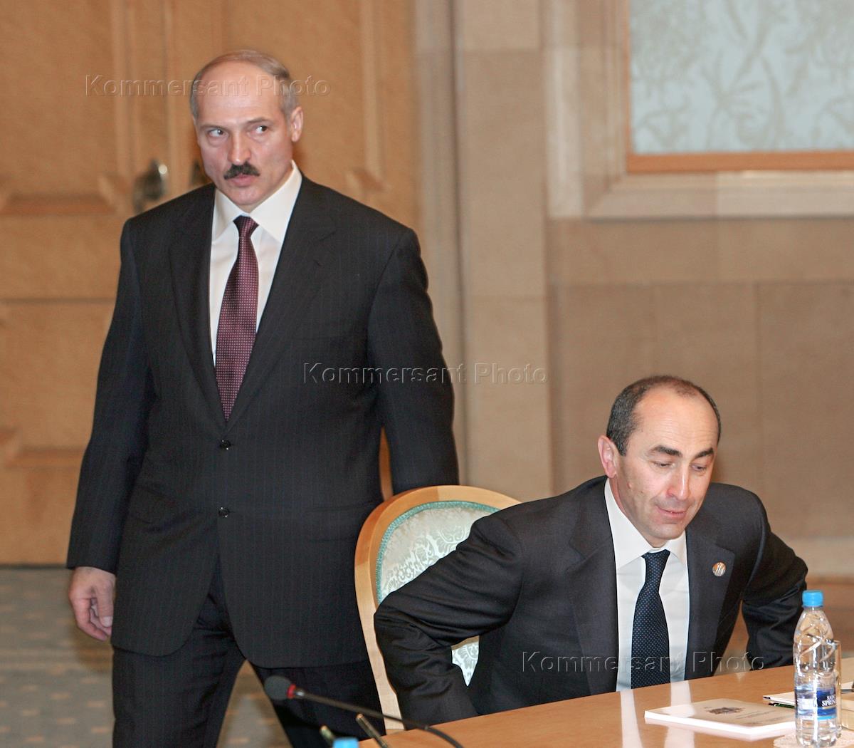 Празднование 60-летия Победы во Второй Мировой Войне. Президент Белоруссии Александр Лукашенко (слева) и президент Армении Роберт Кочарян (справа) во время заседания глав государств, членов Содружества независимых государств (СНГ). Заседание прошло в "Президент-отеле".