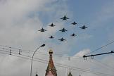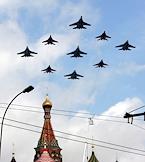 Празднование 60-летия Победы во Второй Мировой Войне. Парад Победы на Красной площади. Пилотажная авиагруппа, состоящая из групп "Русские витязи" и "Стрижи", на боевых самолетах Су - 27 и МиГ - 29 пролетела над Красной площадью.