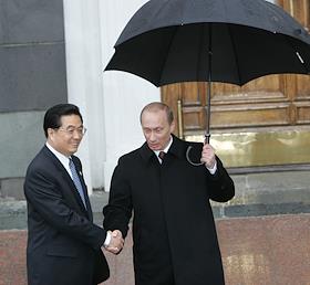 Празднование 60 - летия Победы во Второй Мировой Войне. Президент России Владимир Путин (справа) и председатель Китайской народной Республики (КНР) Ху Цзиньтао (слева) перед началом военного парада на Красной площади.