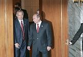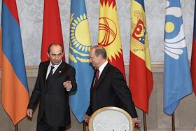 Празднование 60 - летия Победы во Второй Мировой Войне. Президент России Владимир Путин (справа) и президент Армении Роберт Кочарян (слева) во время заседания глав государств, членов Содружества независимых государств (СНГ). Заседание прошло в "Президент-отеле".