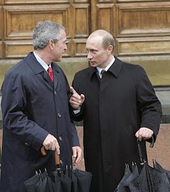 Празднование 60 - летия Победы во Второй Мировой Войне. Президент России Владимир Путин (справа) встречает президента США Джорджа Буша (слева) перед началом военного парада на Красной площади.