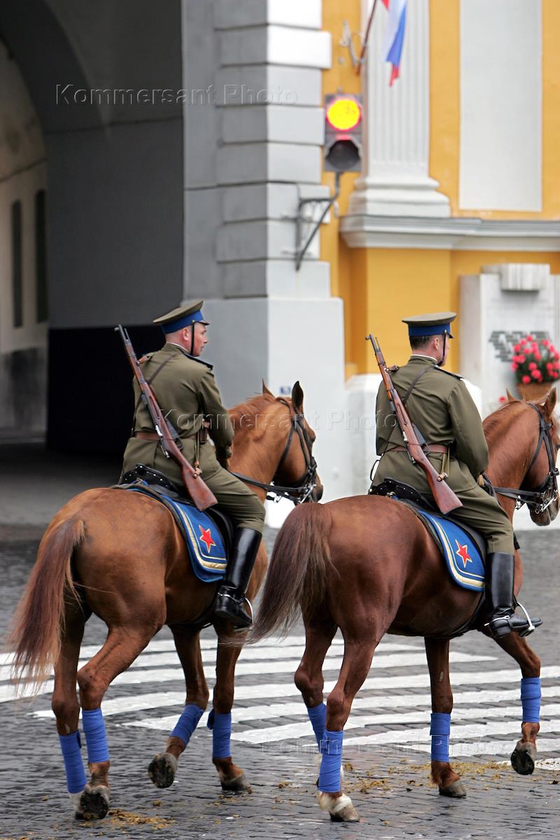 Празднование 60- летия Победы во Второй Мировой Войне. Конный взвод отдельного кавалеристского полка, в военной форме времен Второй Мировой Войны, перед началом военного парада на Красной площади.