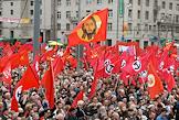Митинг сторонников Коммунистической партии России (КПРФ), посвященный Дню Победы. Митинг прошел на площади у Белорусского вокзала. Флаги КПРФ, Национал-большевистской партии (НБП), партии "Родина", Авангарда коммунистической молодежи (АКМ).