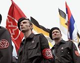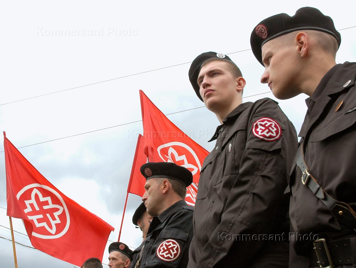 Активисты националистического движения "Русское национальное единство" (РНЕ) на митинге сторонников Коммунистической партии России (КПРФ), посвященном Дню Победы. Митинг прошел на площади у Белорусского вокзала.
