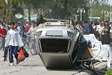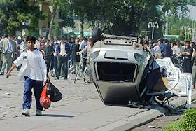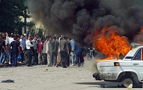 Вооруженный мятеж и многотысячный митинг в центре города, участники которого обвиняют власти в отсутствии демократии и свободы. В ночь на пятницу 13 мая 2005 года группа боевиков из исламской организации "Хизб-ут-Тахрир" напала на здание городской тюрьмы и освободила, по разным оценкам, от 2 до 4 тысяч заключенных. Мятежники завладели оружием и захватили здание областной администрации. В ходе столкновений с правительственными войсками число жертв в Андижане до сих пор неизвестно. По разным данным там погибли от нескольких десятков до нескольких сот человек. Последствия мятежа: разбитые и горящие автомобили на улице города.