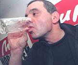 Художественный руководитель театра "Сатирикон" Константин Райкин пьет воду из стакана на пресс-конференции, которая состоялась в редакции газеты "Мир новостей".