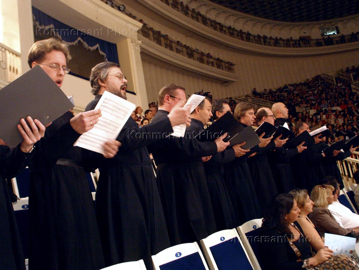 Дирижер Теодор Курентзис (справа) во время премьерного исполнения Пятой симфонии композитора Алексея Рыбникова с Национальным филармоническим оркестром России. Премьера прошла в рамках открытого фестиваля искусств "Черешневый лес" в Концертном зале имени Чайковского.